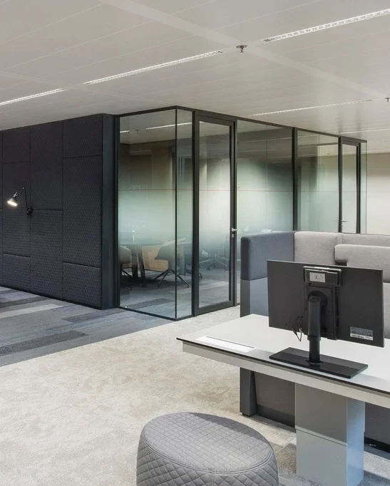 Ook kan bij het ontwerpen van jouw kantoorindeling glazen scheidingswanden worden toegevoegd. Zo behoud je een open uitstraling maar creëer je toch meer privacy. Ideaal voor overlegruimtes waar meerdere personen samenkomen.